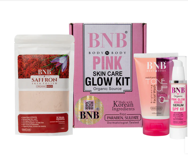 The Pink Glow Kit includes three key products: BNB Tone Up Facewash, Saffron Face Mask, and Pink Glow SPF. This set is designed to cleanse, brighten, and protect your skin, leaving it with a radiant and glowing finish.